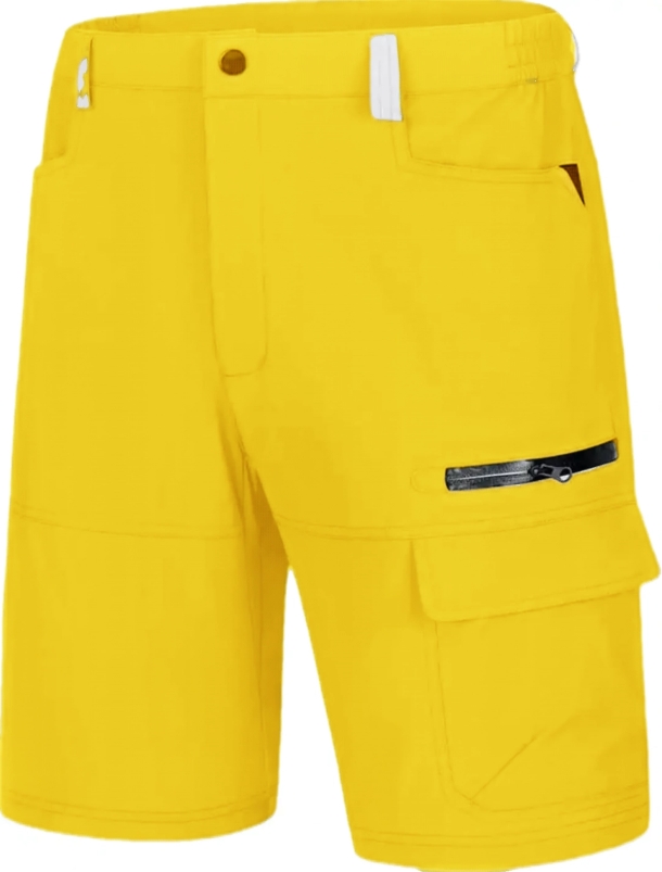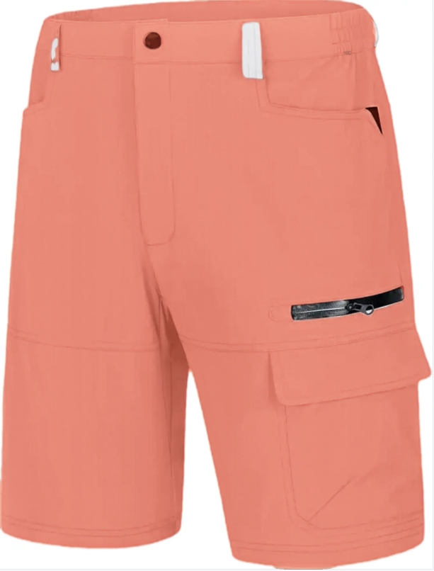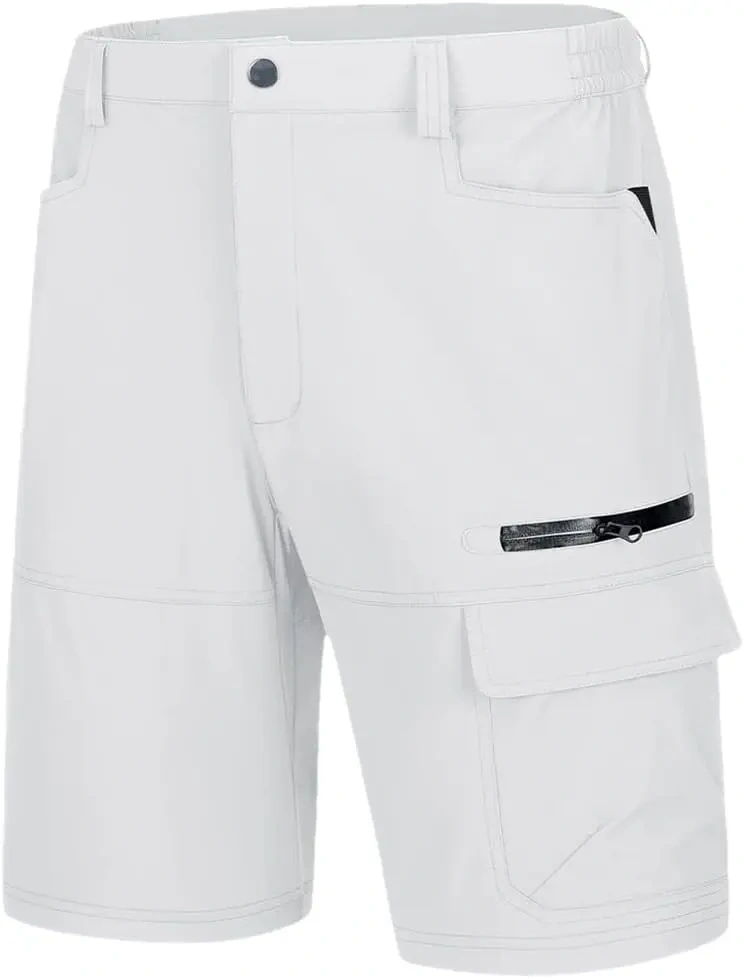 Fabric: 90% Nylon,10% Spandex.High-tech ripstopand nylon fabric suitable for various outdoor activities.These fabrics feature quick dry, stretchy, breathable, waterproofWaterproof: The Hiking Shorts are made ofwaterproof material, effectively repels stains and liquids5 Pockets: This men's quick dry short features 2 handpockets, 1 waterproof zipper pocket, 1 large cargo pocketat left thigh, 1 rear zipper pockets for the ultimateconvenience and efficiencyDesign: Men's cargo shorts features a partial elasticwaist, button closure with zip fly. Elastic waist with beltloop offer more flexible for a personalized fit.lts innerlength is 9 inches Occasions:These summer shorts are suitable forhiking, climbing, camping, hunting, fishing,mountaineering,traveling and other outdoor activities