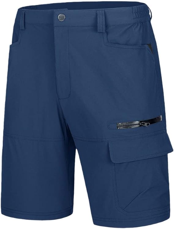 Fabric: 90% Nylon,10% Spandex.High-tech ripstopand nylon fabric suitable for various outdoor activities.These fabrics feature quick dry, stretchy, breathable, waterproofWaterproof: The Hiking Shorts are made ofwaterproof material, effectively repels stains and liquids5 Pockets: This men's quick dry short features 2 handpockets, 1 waterproof zipper pocket, 1 large cargo pocketat left thigh, 1 rear zipper pockets for the ultimateconvenience and efficiencyDesign: Men's cargo shorts features a partial elasticwaist, button closure with zip fly. Elastic waist with beltloop offer more flexible for a personalized fit.lts innerlength is 9 inches Occasions:These summer shorts are suitable forhiking, climbing, camping, hunting, fishing,mountaineering,traveling and other outdoor activities