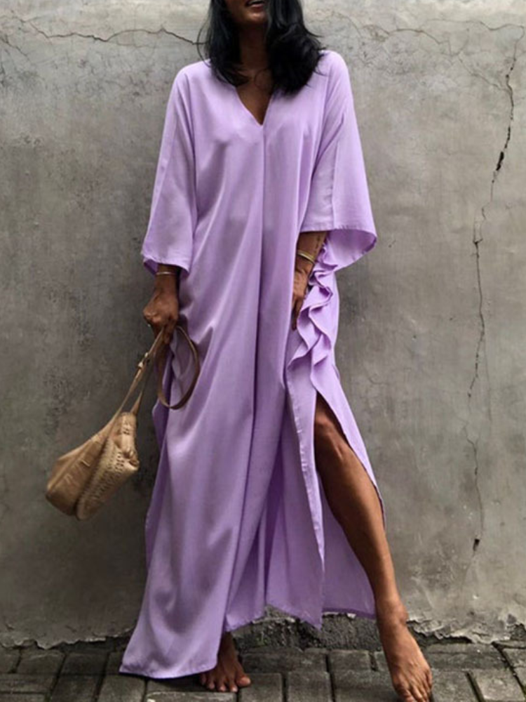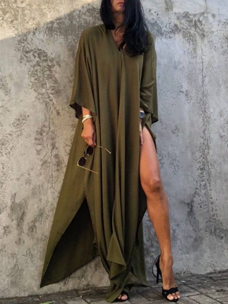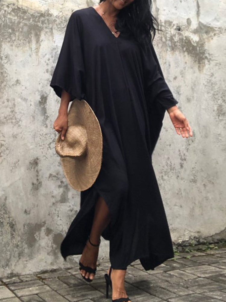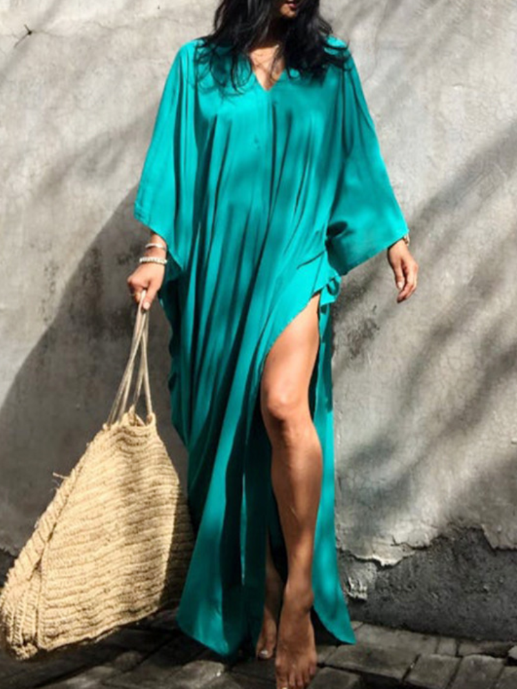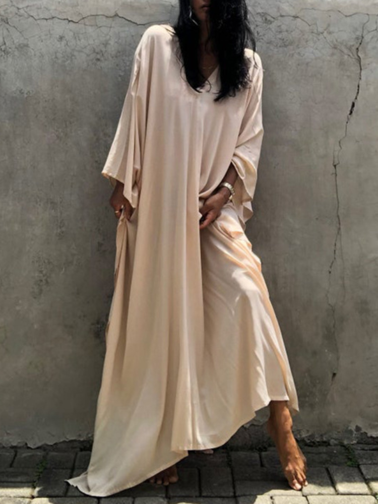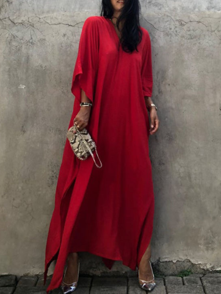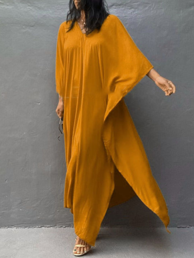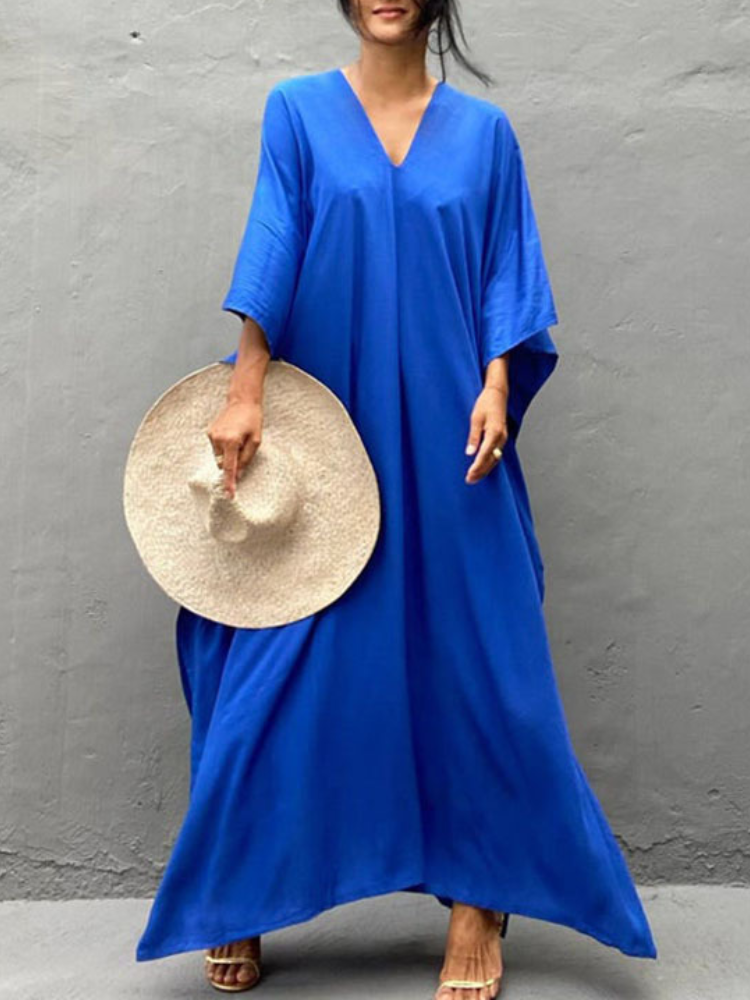Womens V Neck Long Sleeve Solid Pattern Kaftan Maxidress