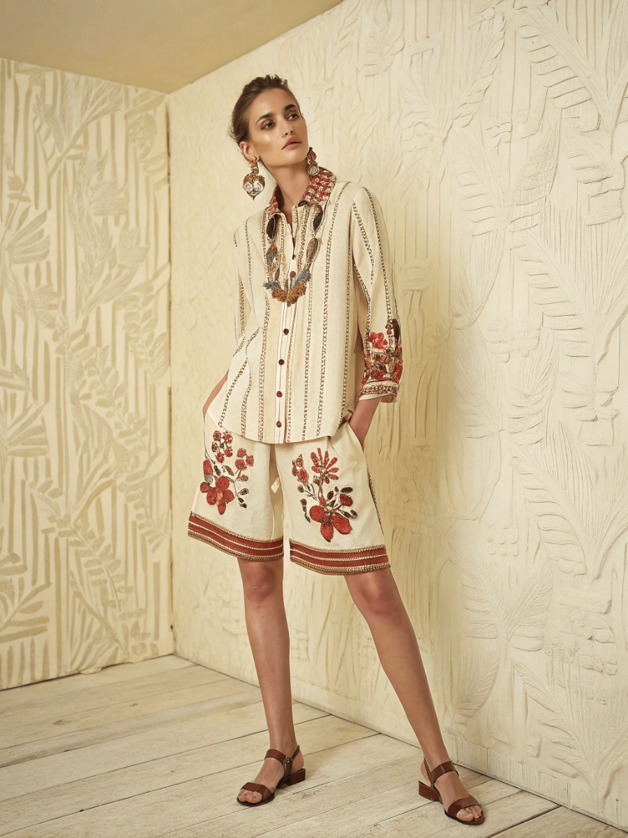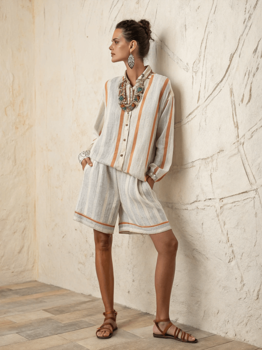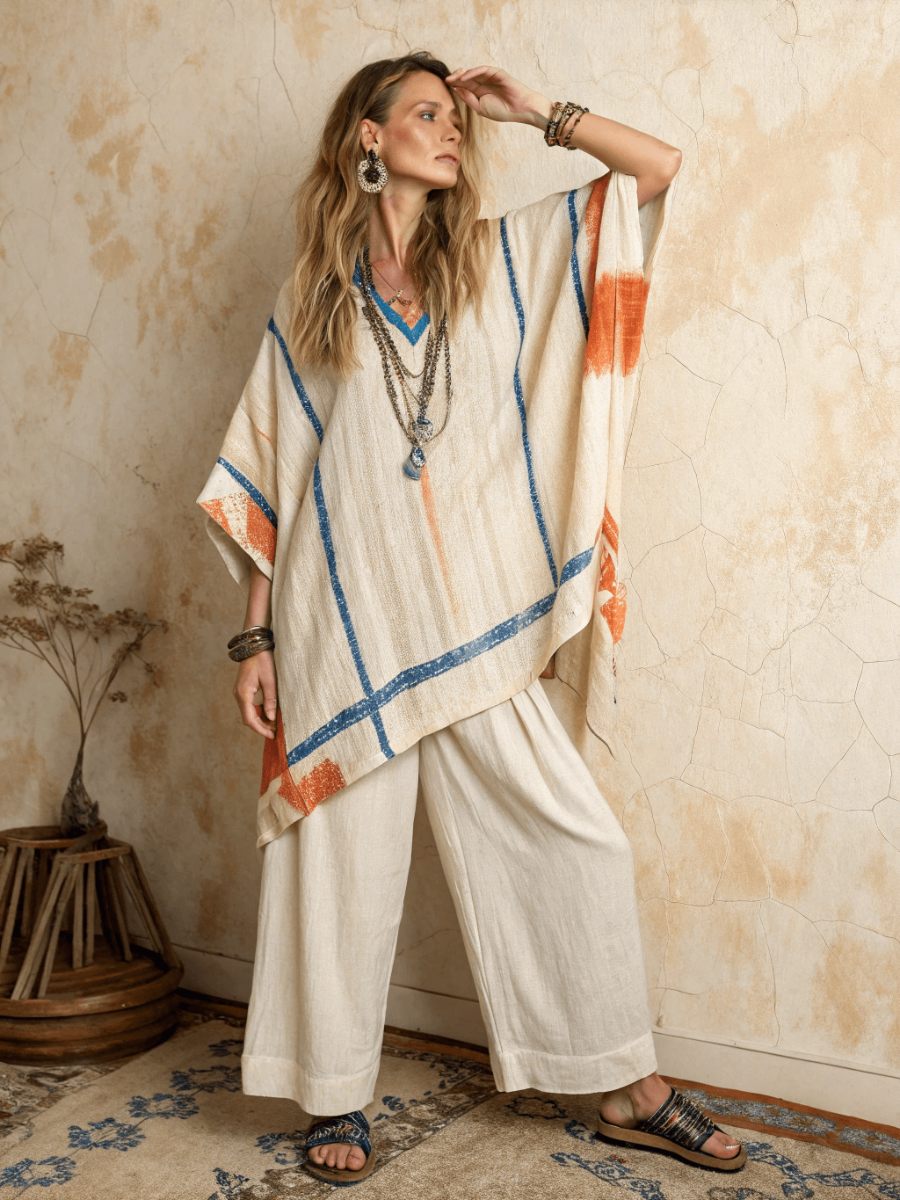Kimono art abstract flower pattern linen lace-up coat and trousers two-piece suit