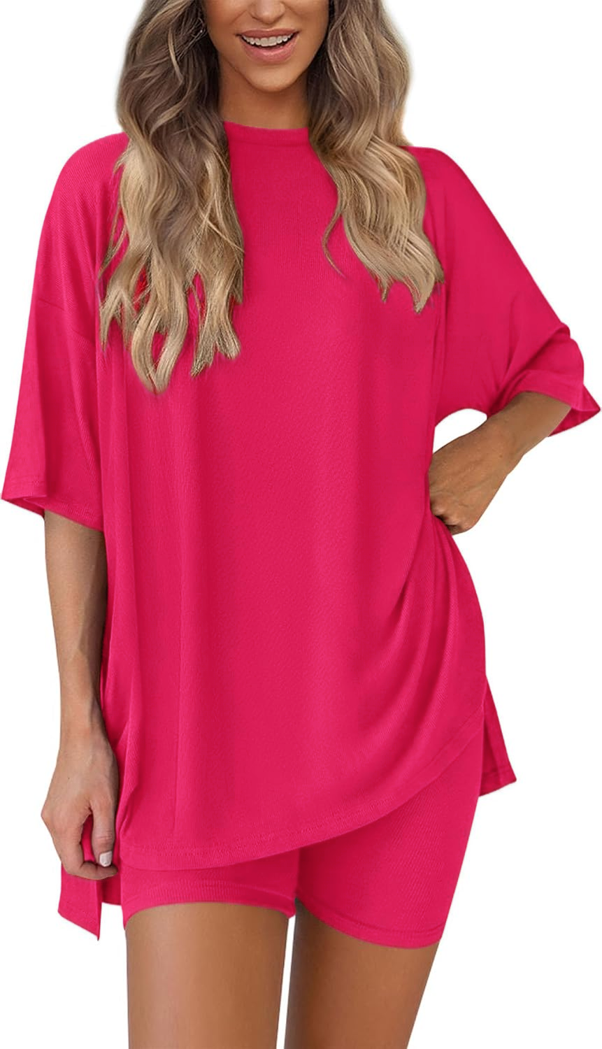 Women's Two Piece Lounge Set Casual Oversized Crewneck Tops and High Waisted Shorts Set