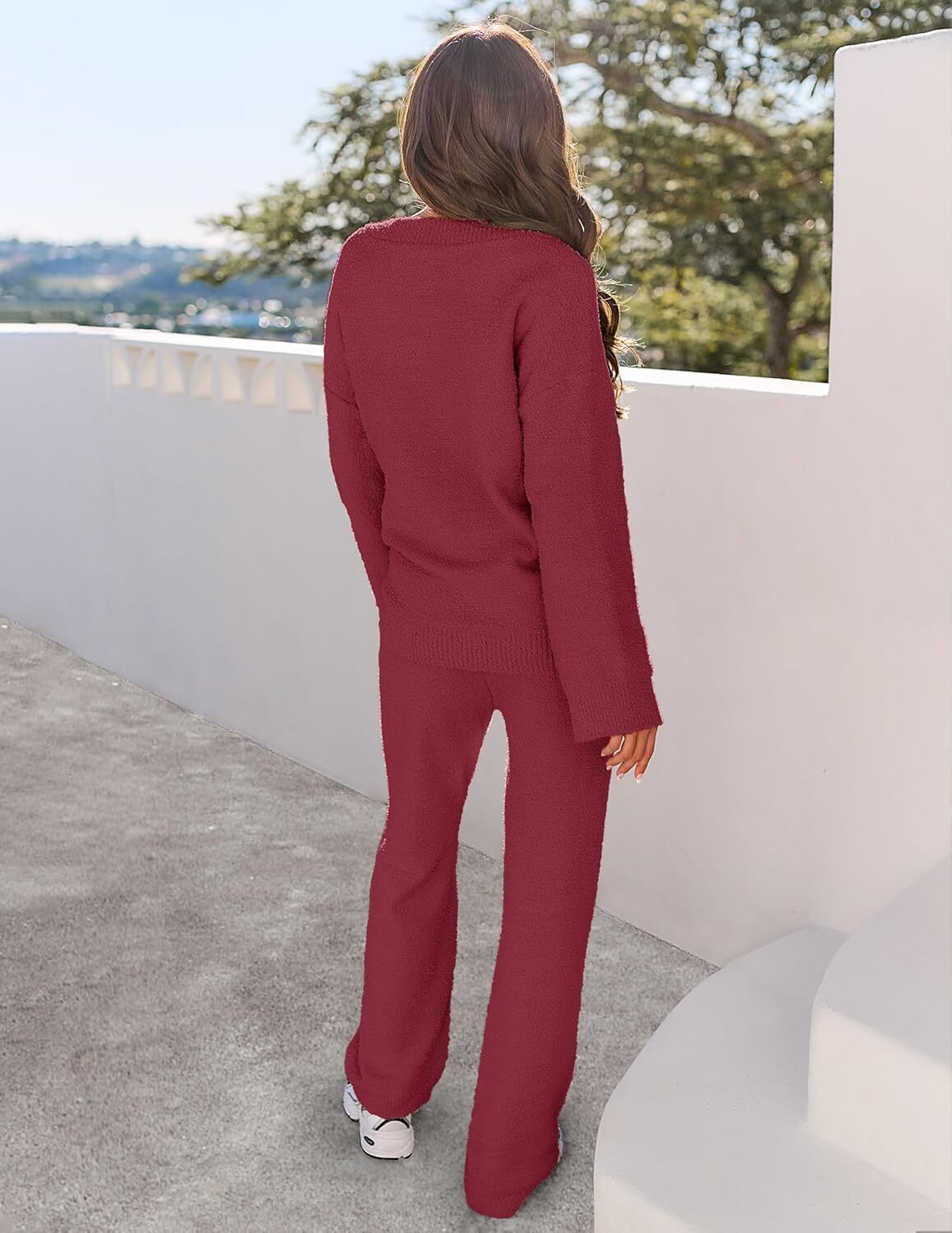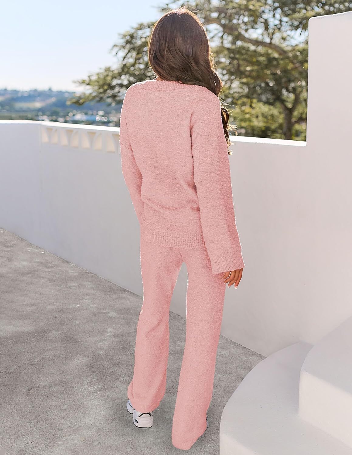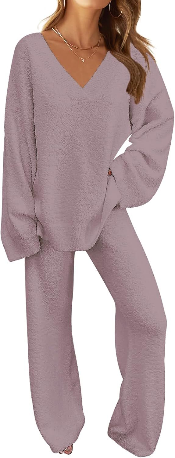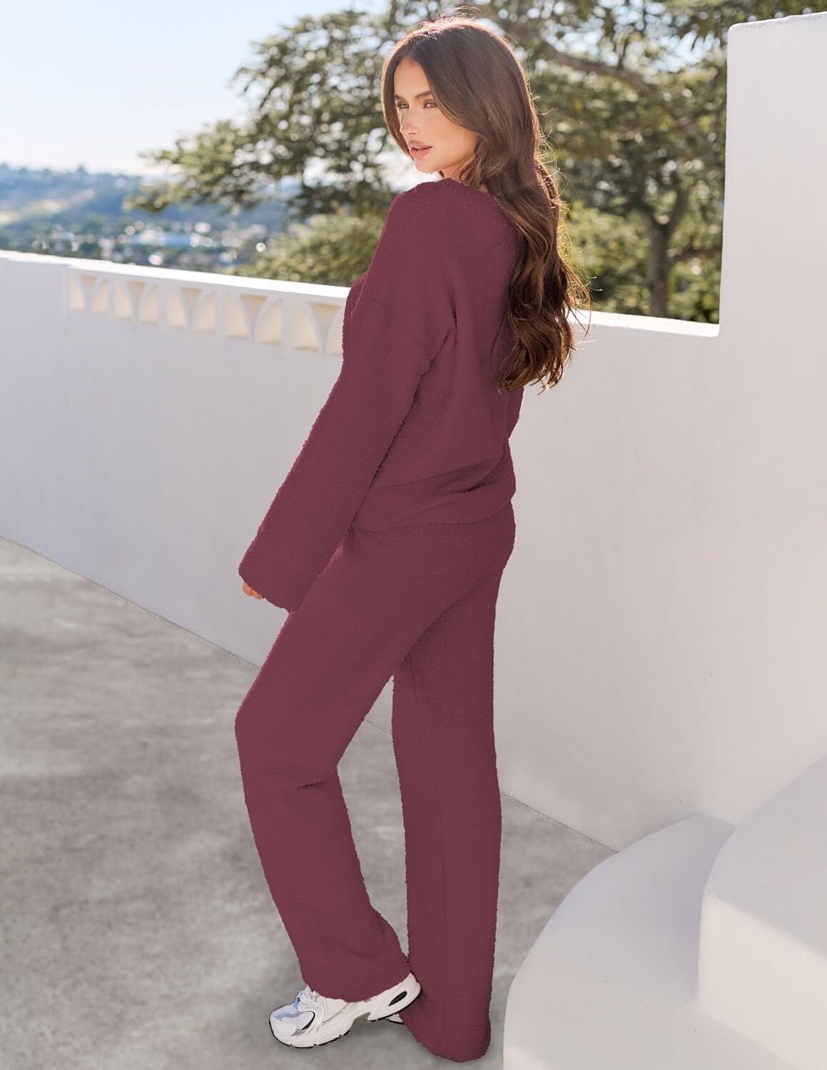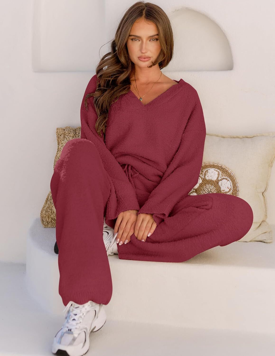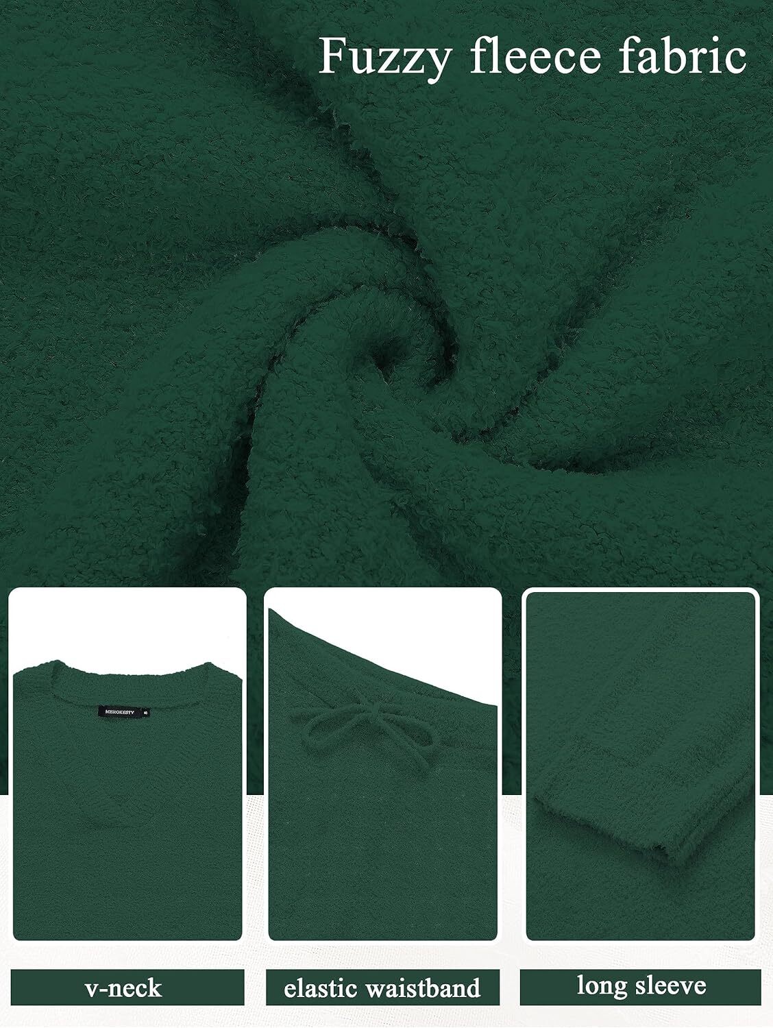 Casual Winter Pajama Set Long Sleeve V Neck Fuzzy Fleece Knitted Pj Sweater Sets