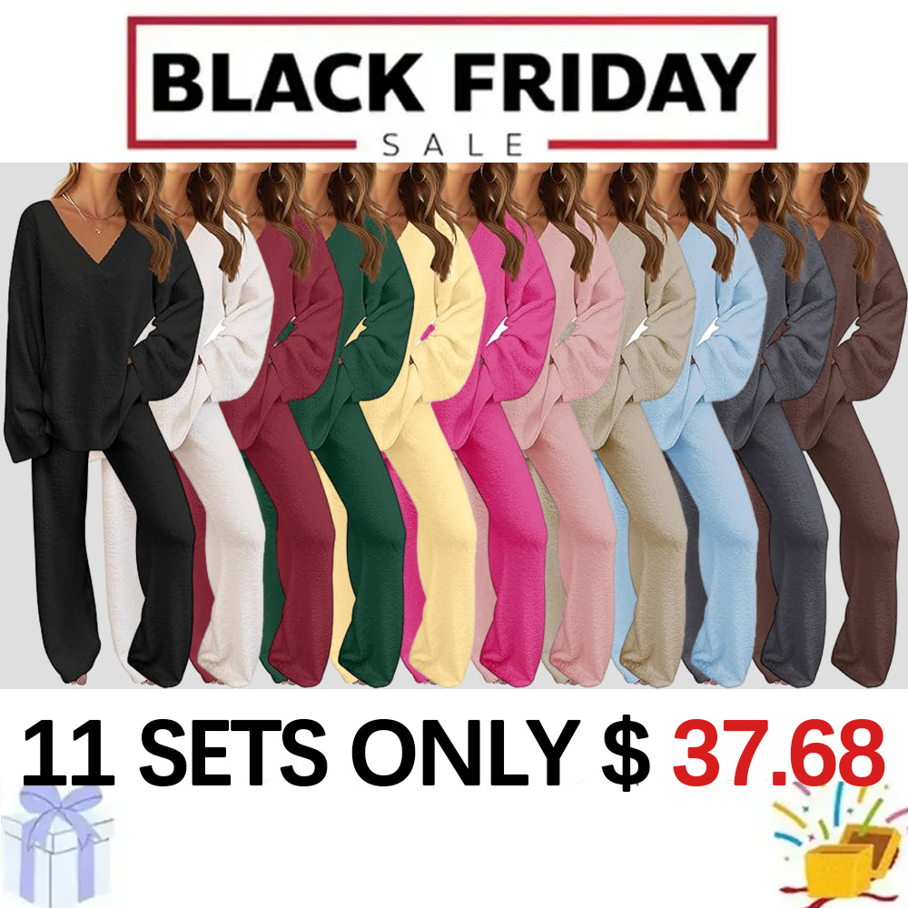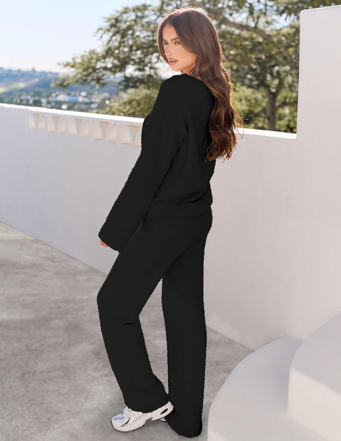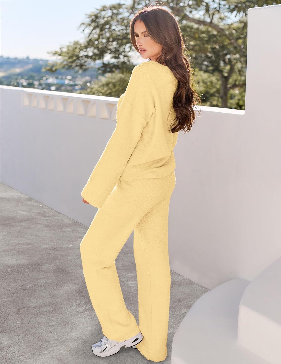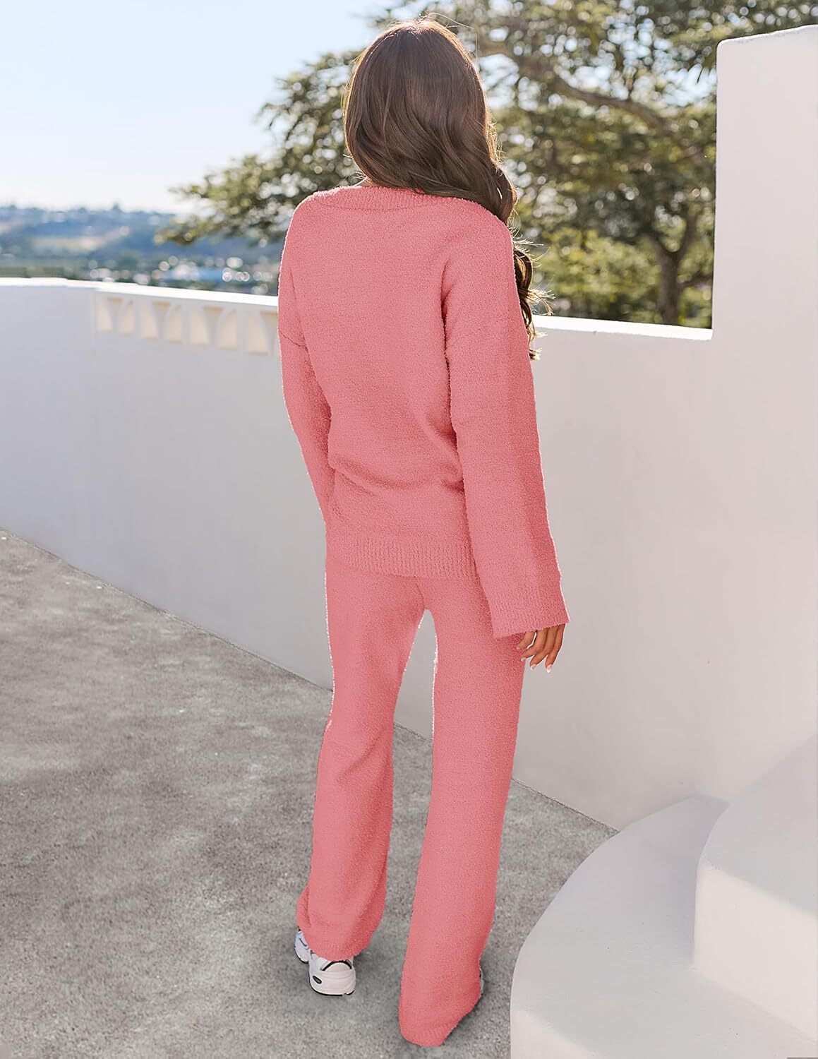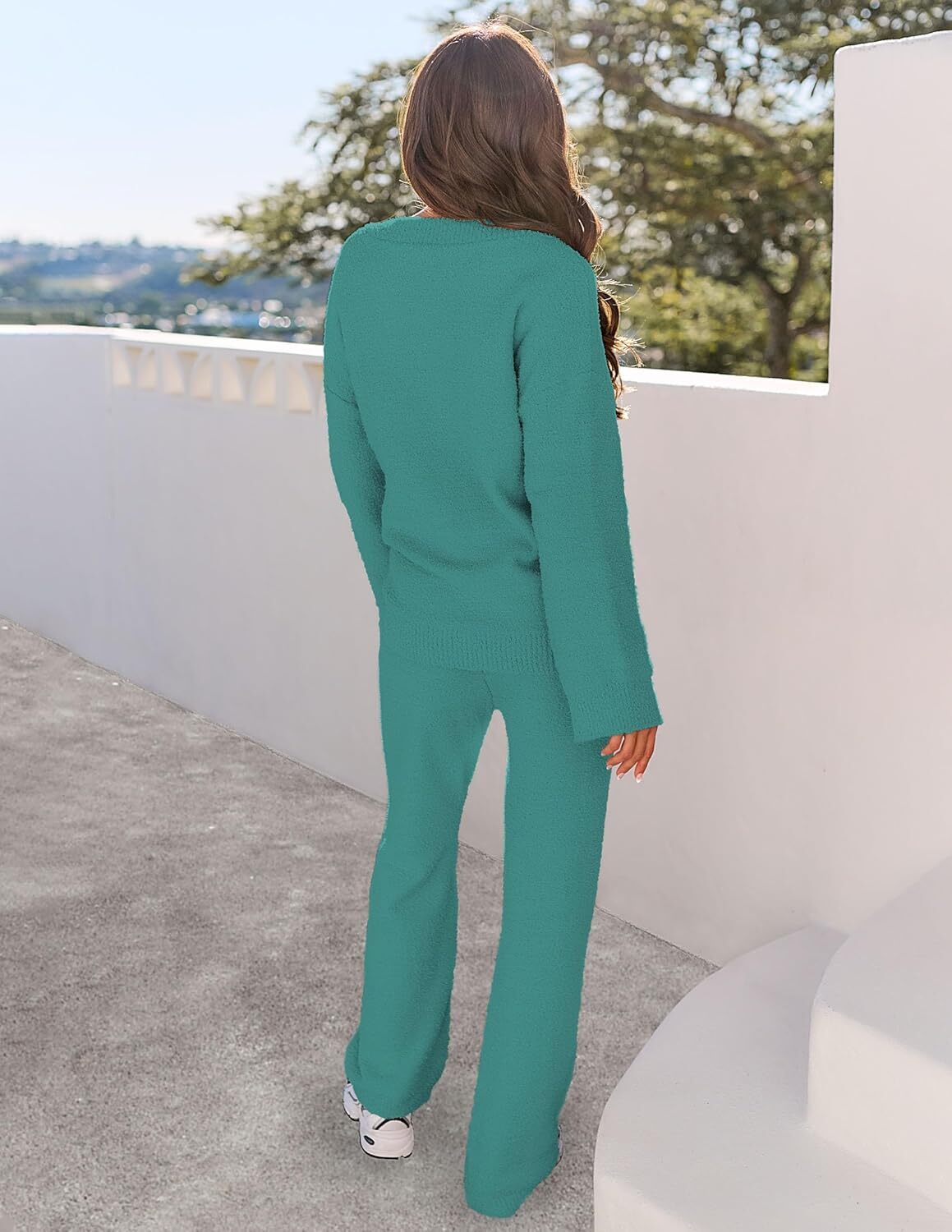 Casual Winter Pajama Set Long Sleeve V Neck Fuzzy Fleece Knitted Pj Sweater Sets