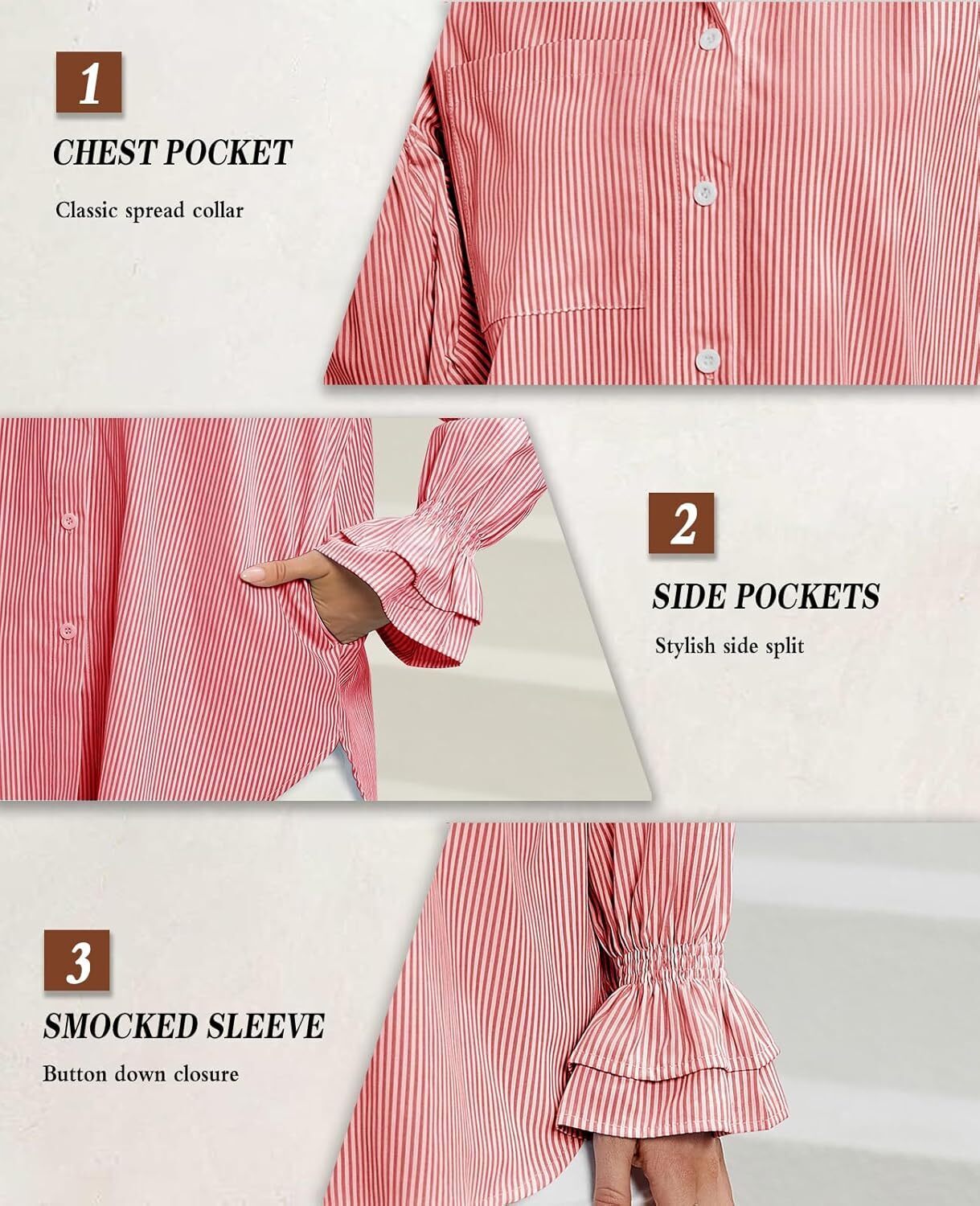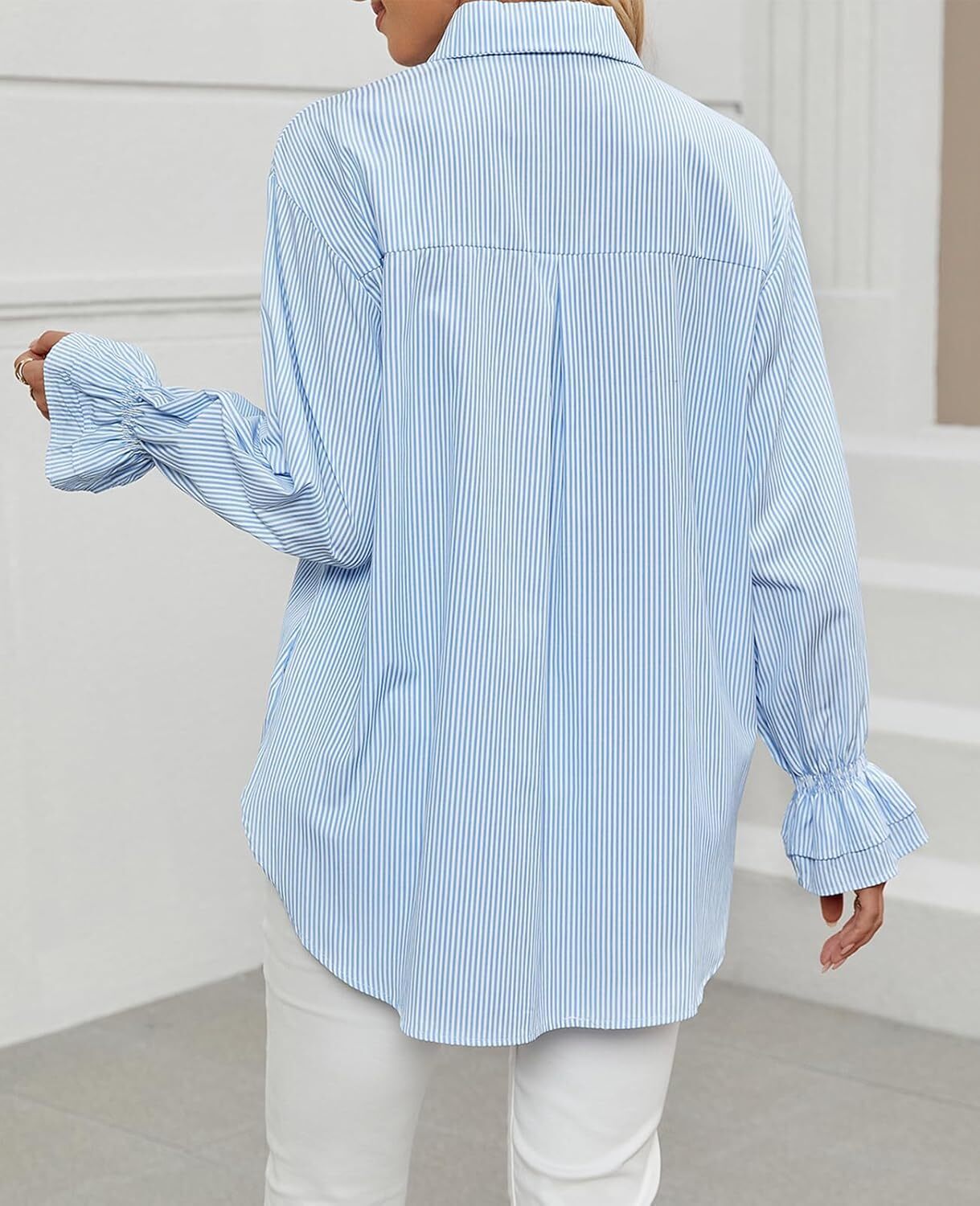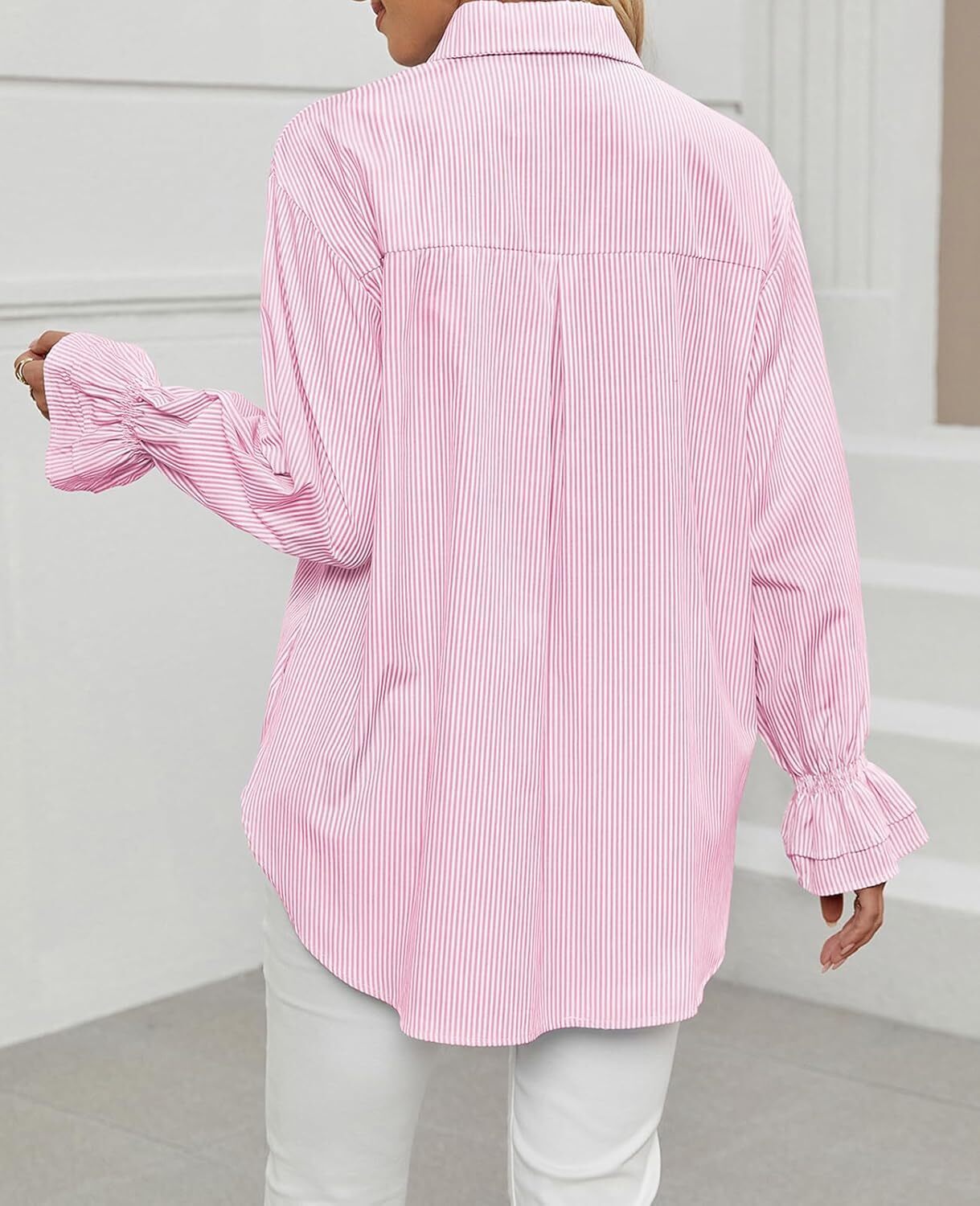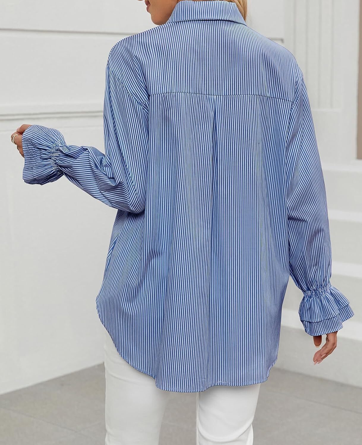 • Women's Striped Button Down Shirts Smocked Cuffed Boyfriend Shirt Long Sleeve Blouse Top with 3 Pockets