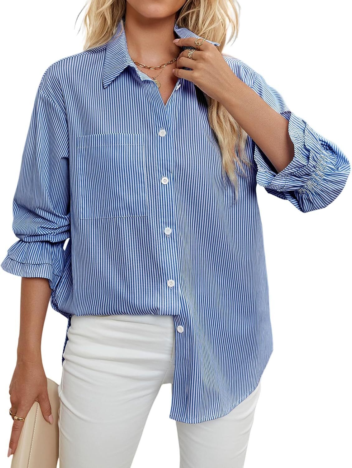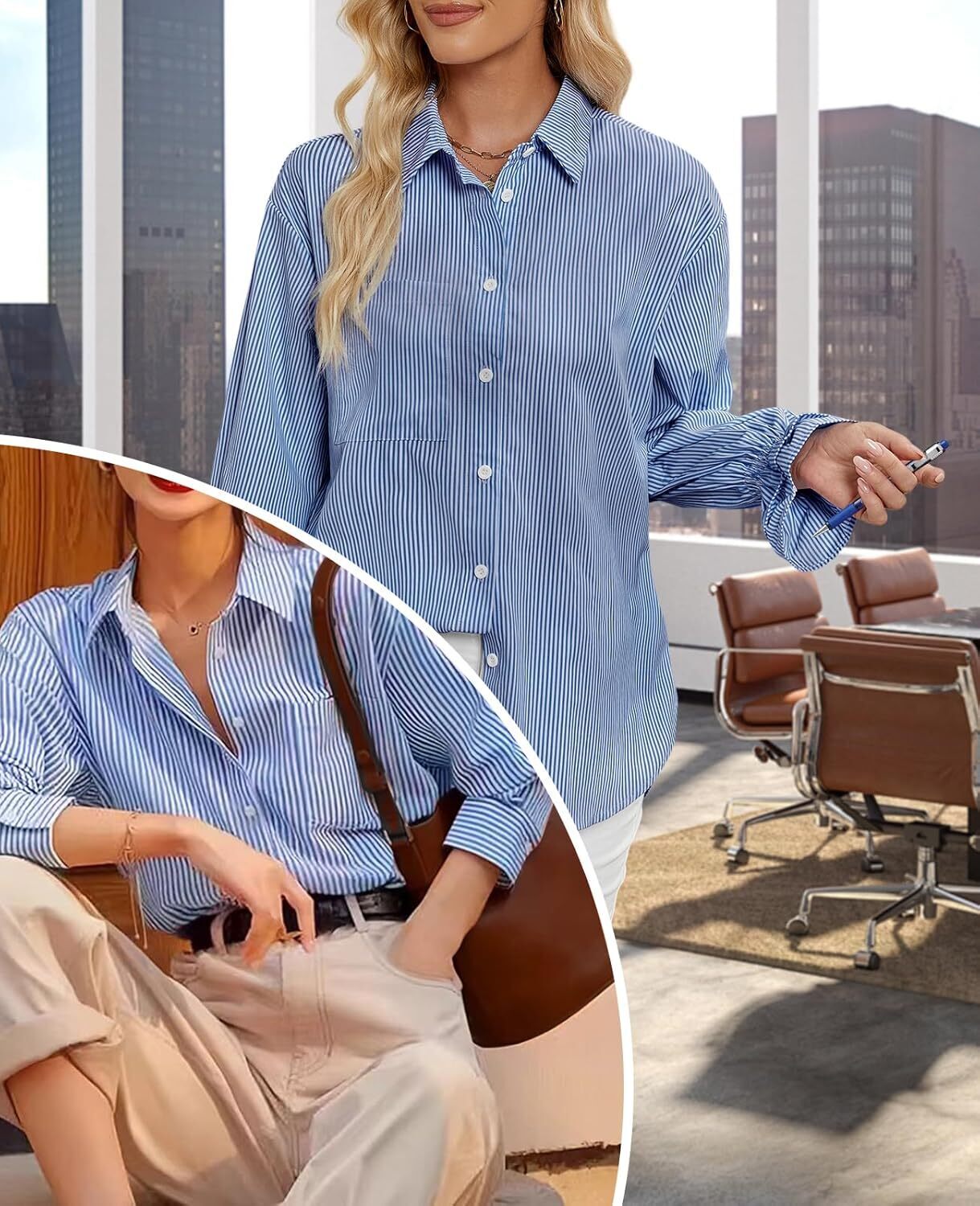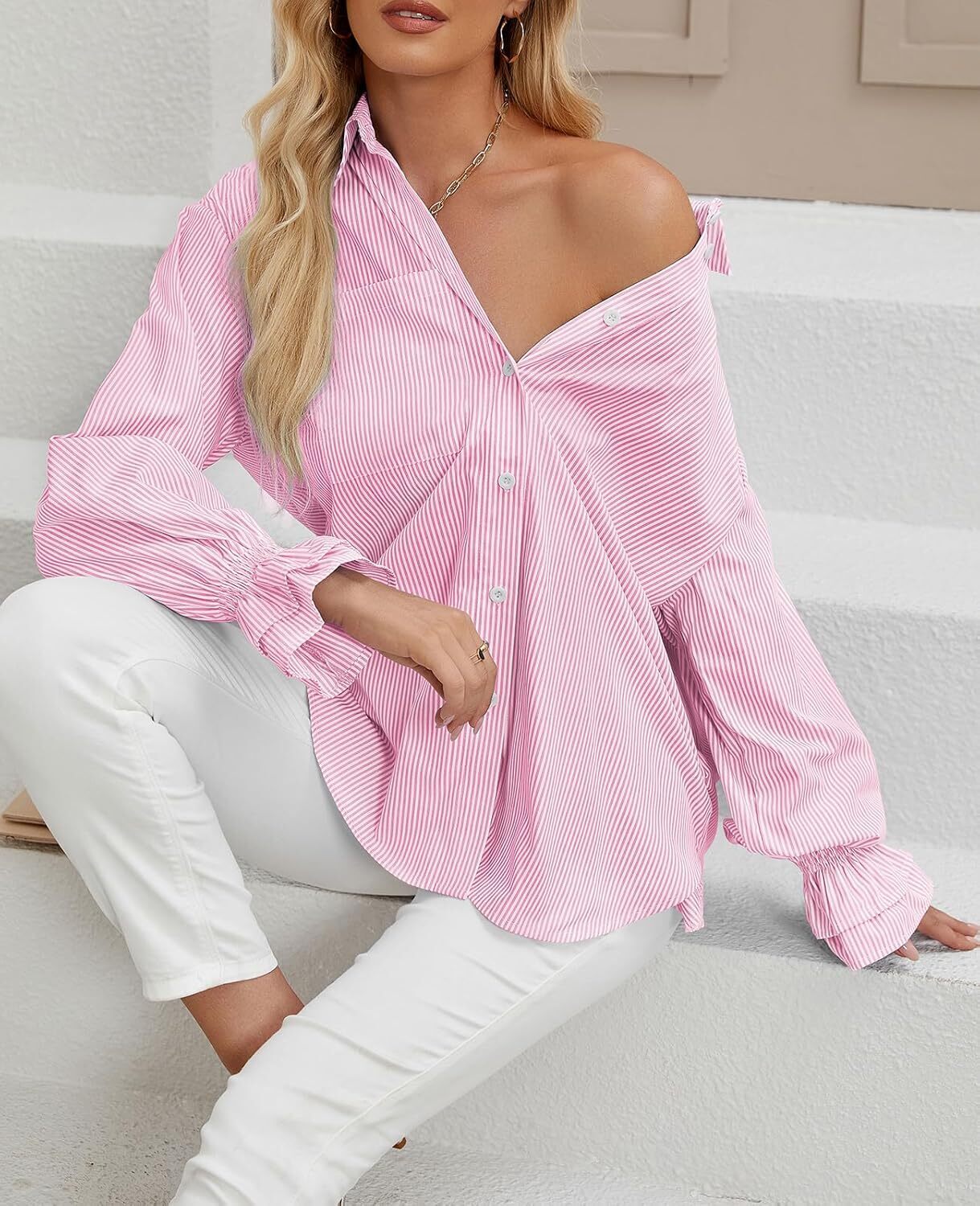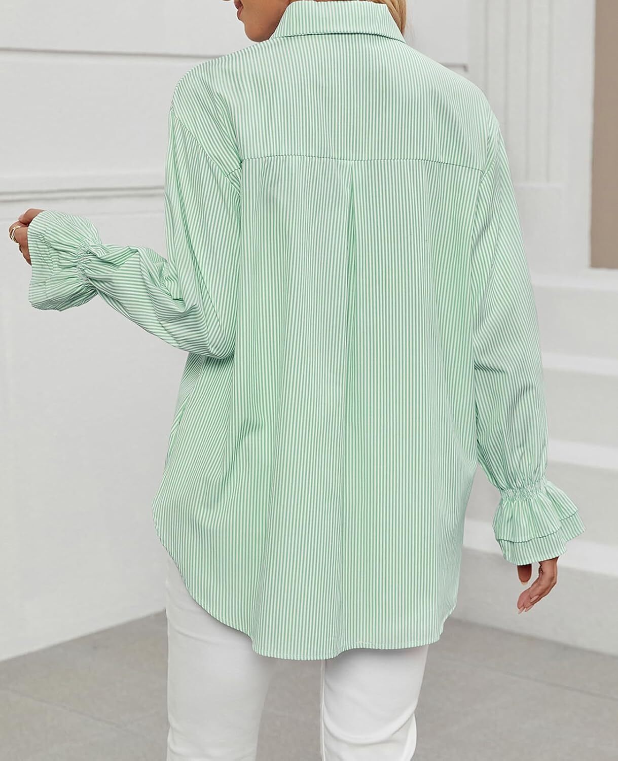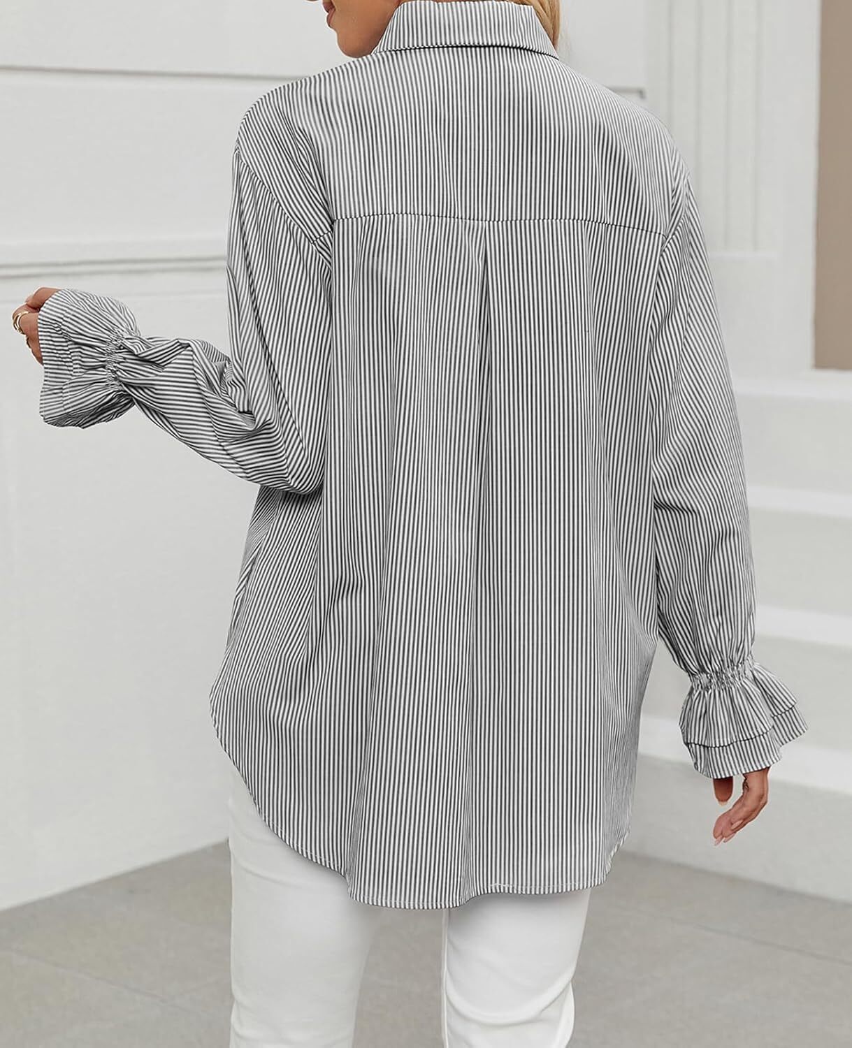 • Women's Striped Button Down Shirts Smocked Cuffed Boyfriend Shirt Long Sleeve Blouse Top with 3 Pockets