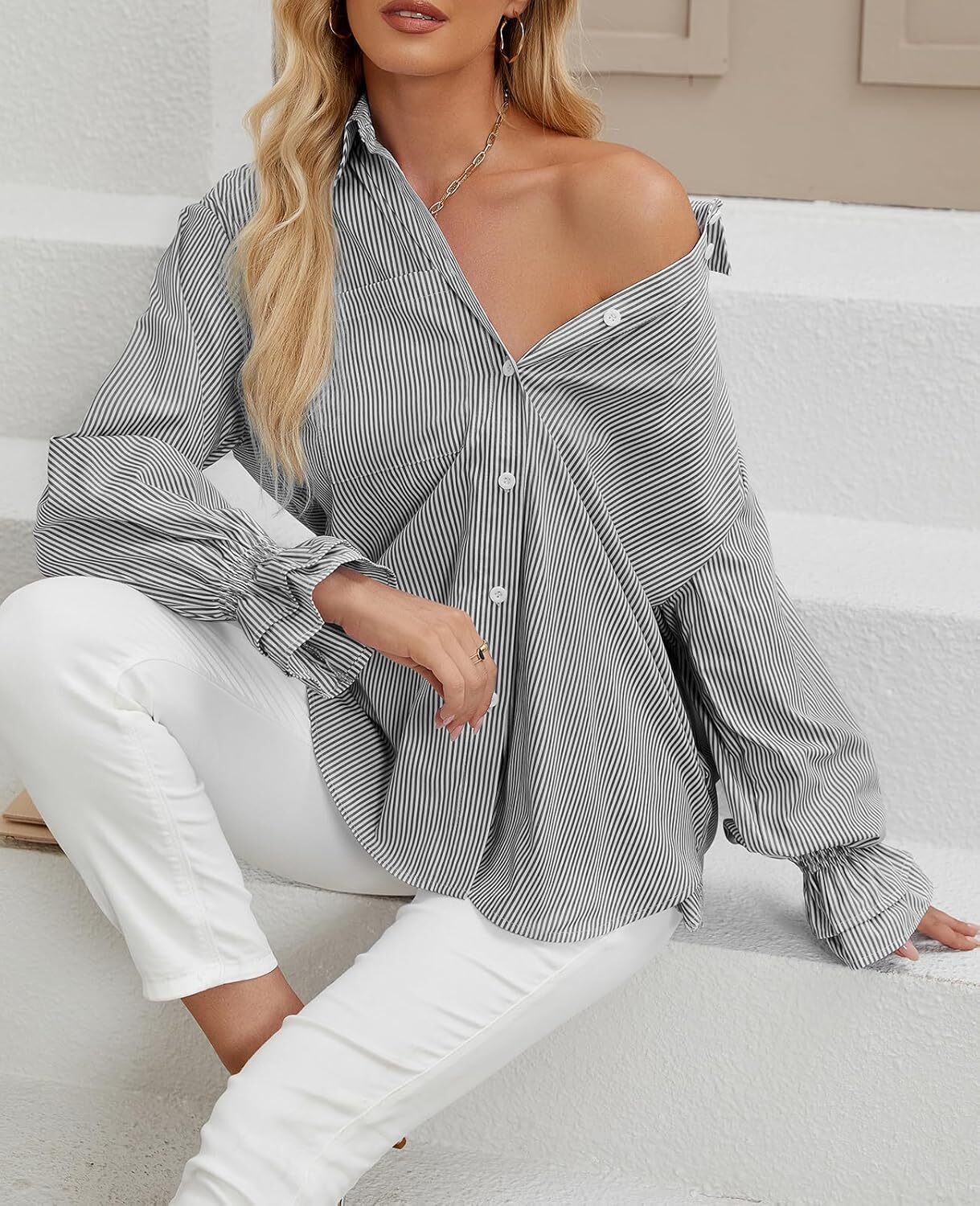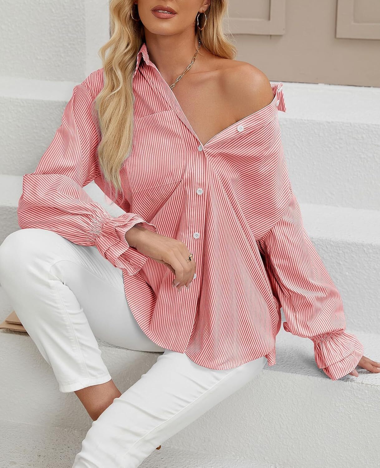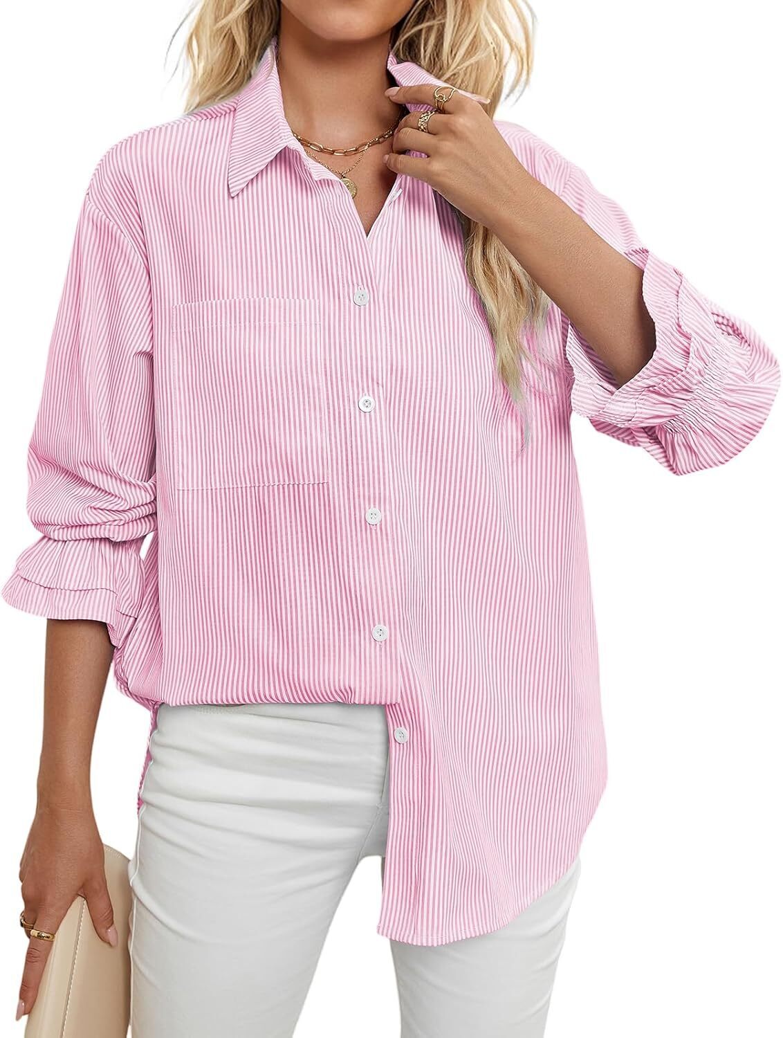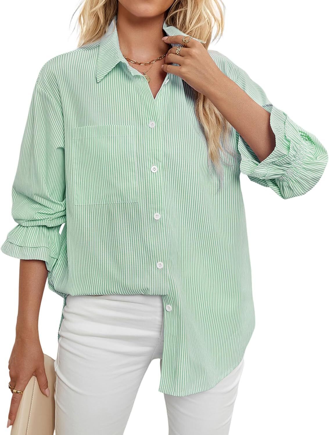• Women's Striped Button Down Shirts Smocked Cuffed Boyfriend Shirt Long Sleeve Blouse Top with 3 Pockets
