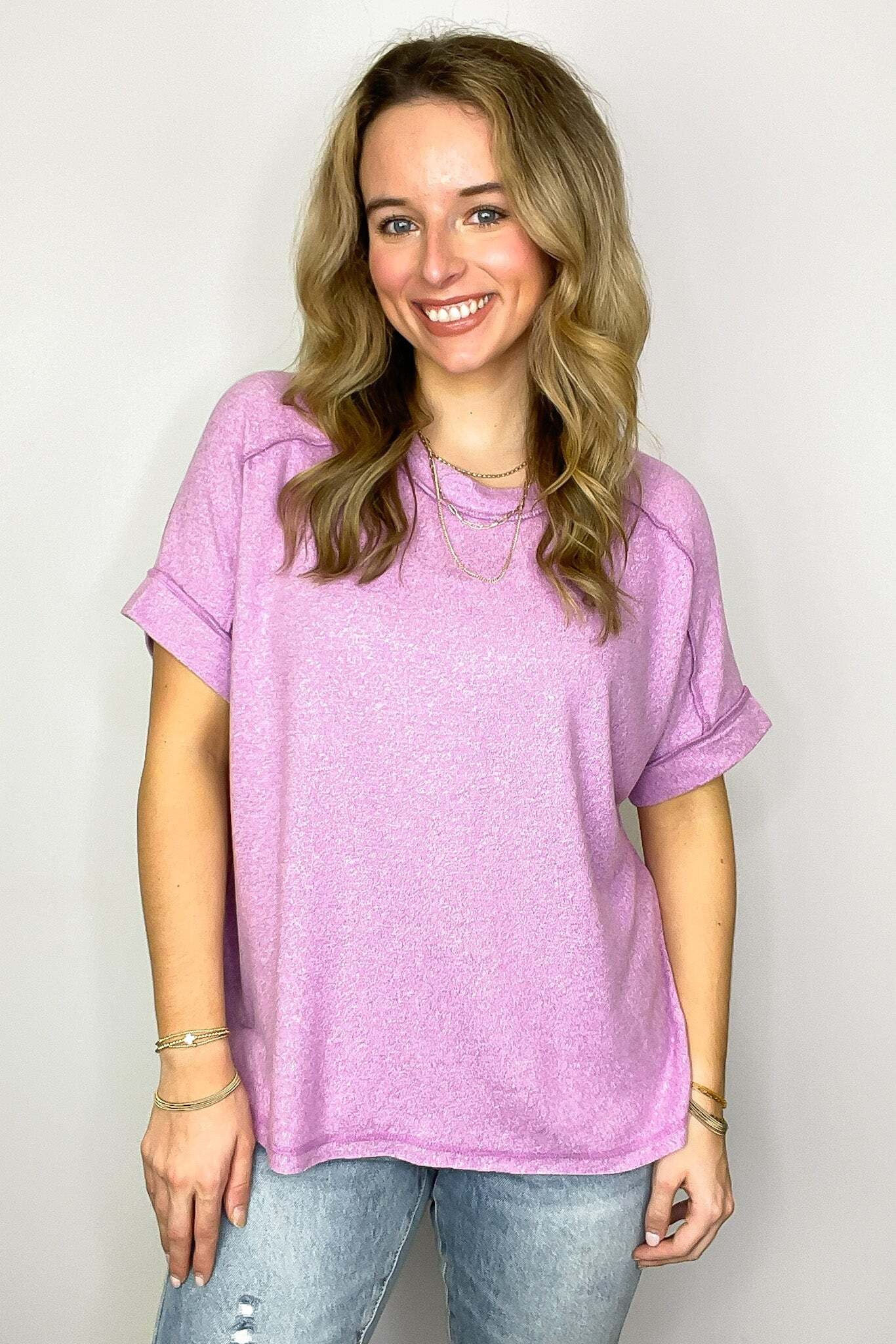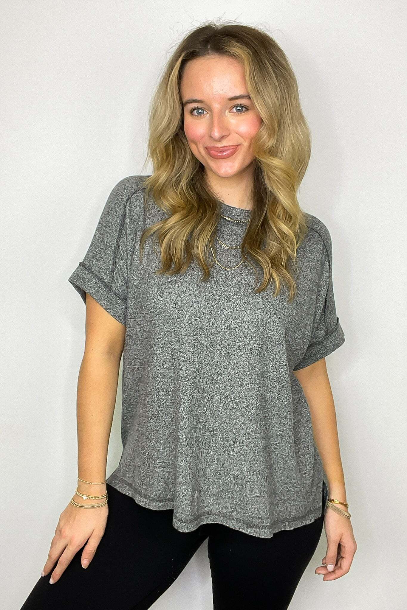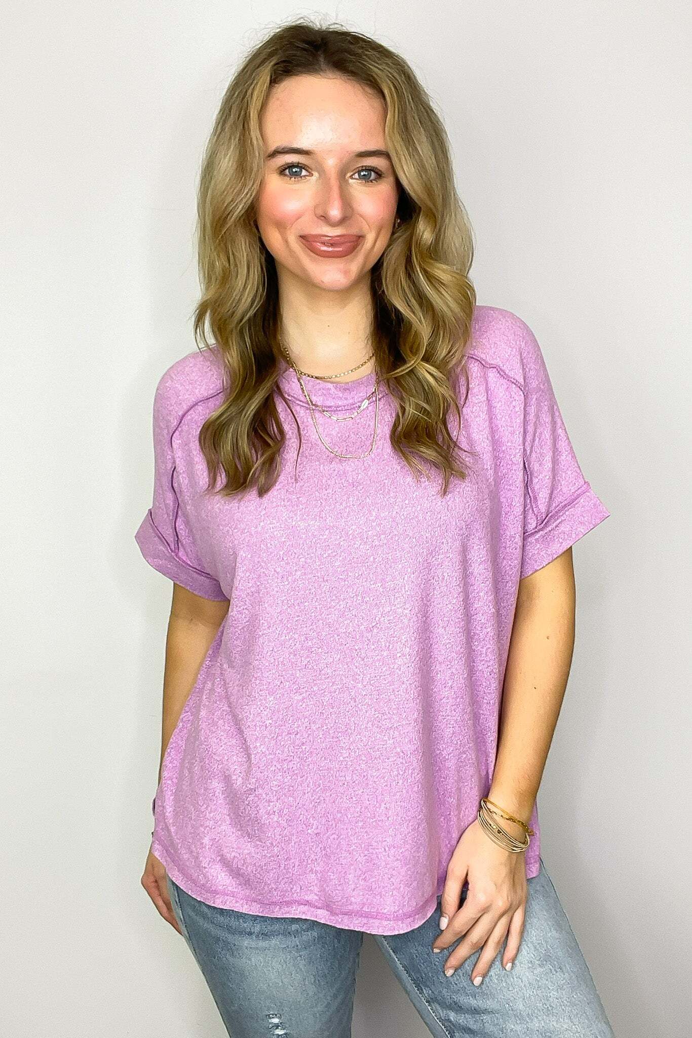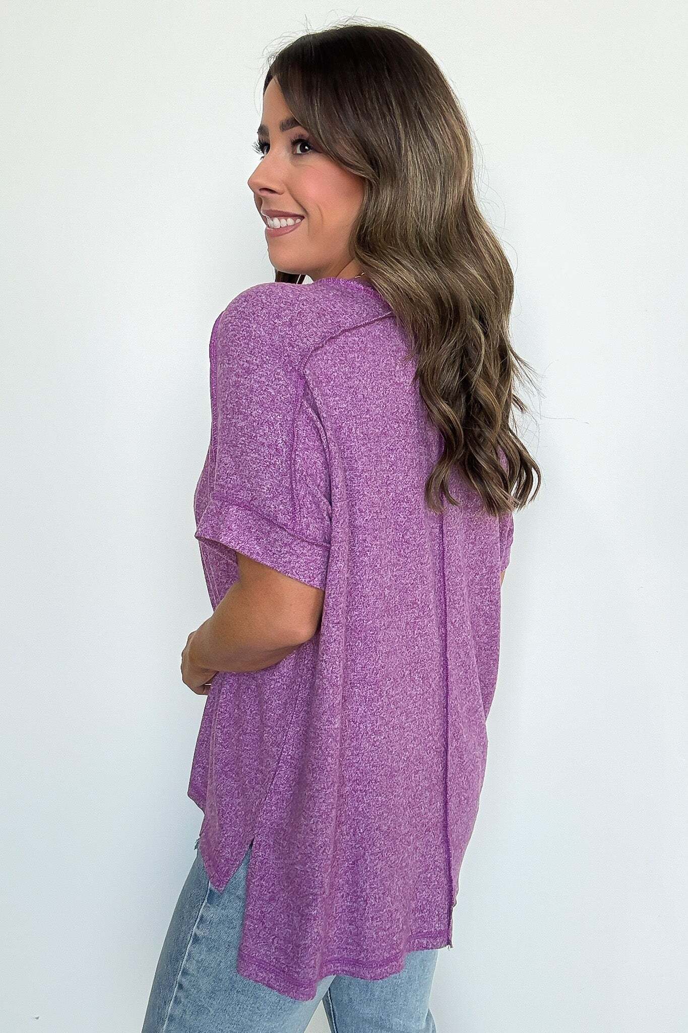 Details: Upgrade your basic tee with our Melange High Low Tee. Made from soft hacci fabric, this tee features folded sleeves and a trendy hi-low hem with side slits. Exposed seams add an edgy touch. Perfect for adding flair to any casual outfit!