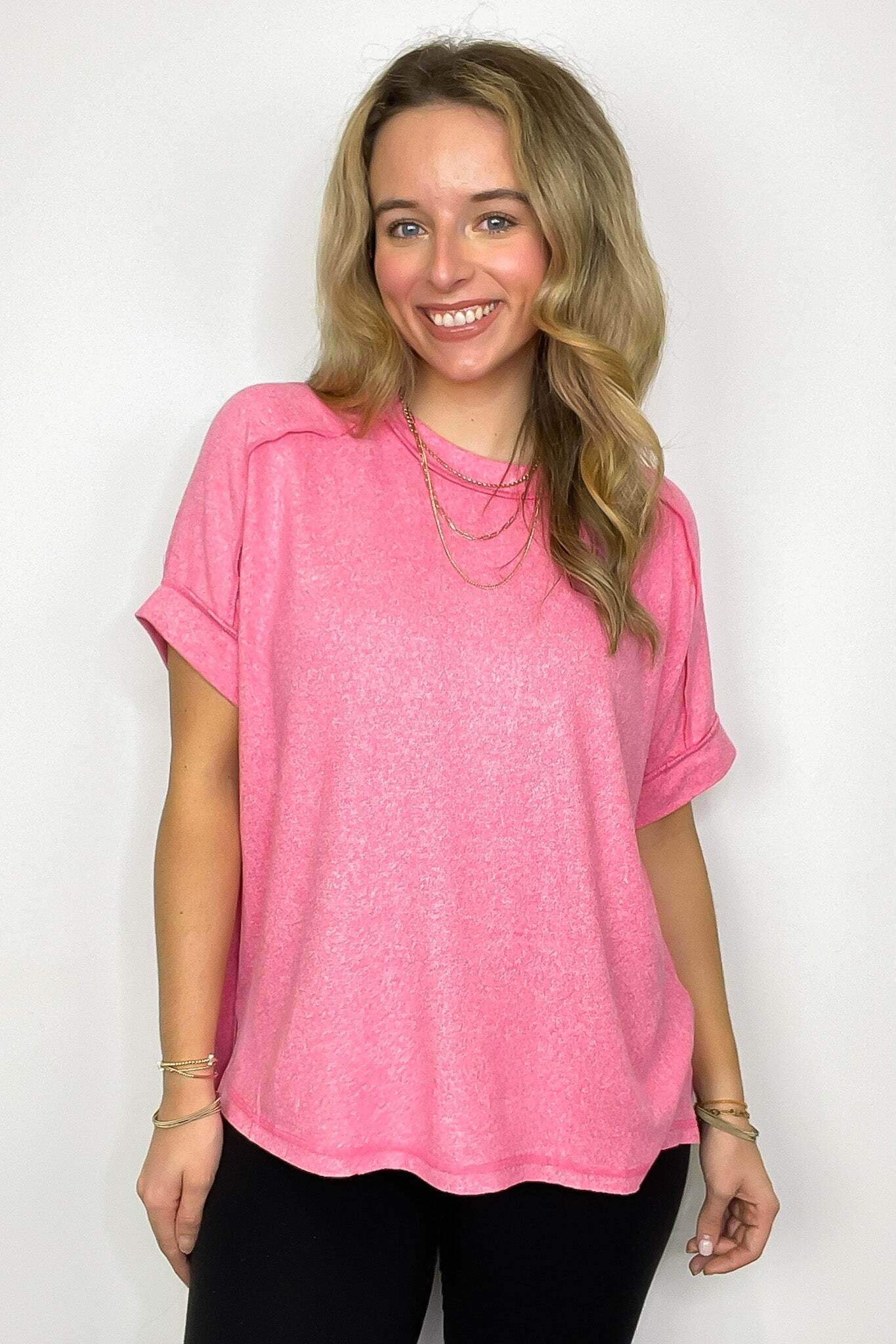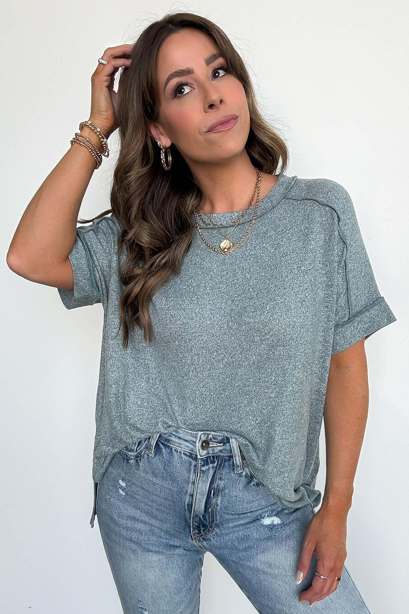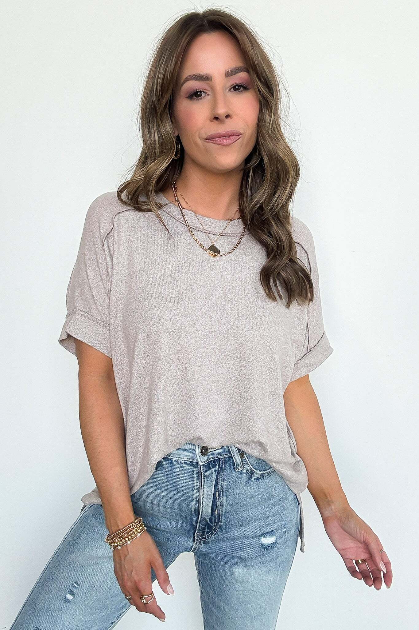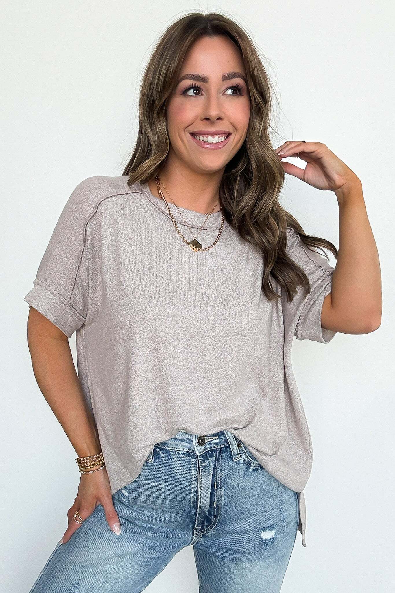 Details: Upgrade your basic tee with our Melange High Low Tee. Made from soft hacci fabric, this tee features folded sleeves and a trendy hi-low hem with side slits. Exposed seams add an edgy touch. Perfect for adding flair to any casual outfit!