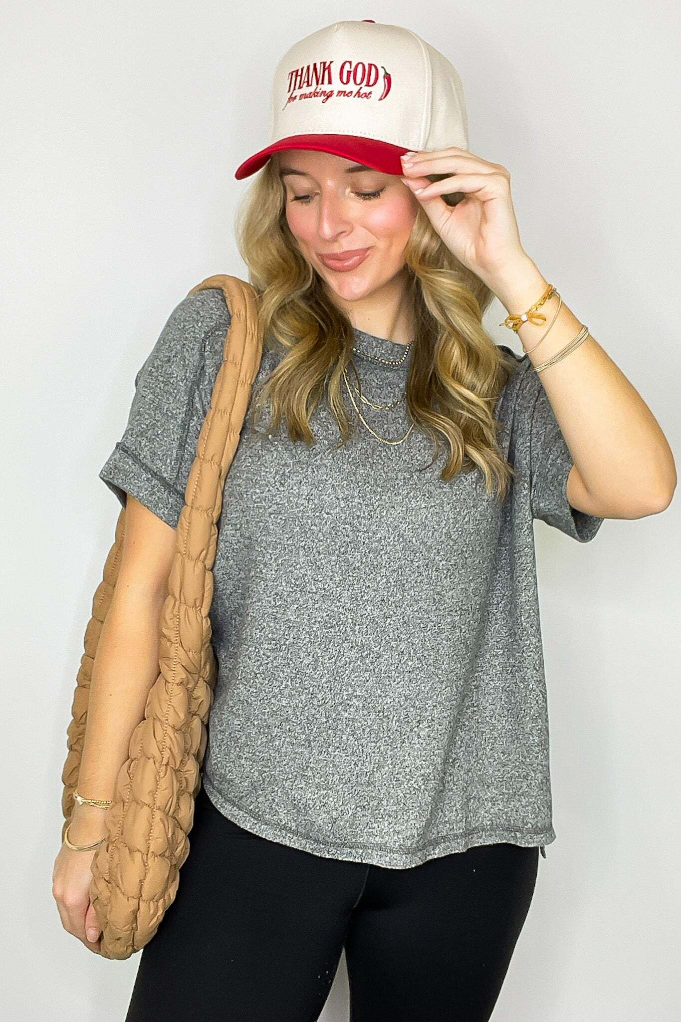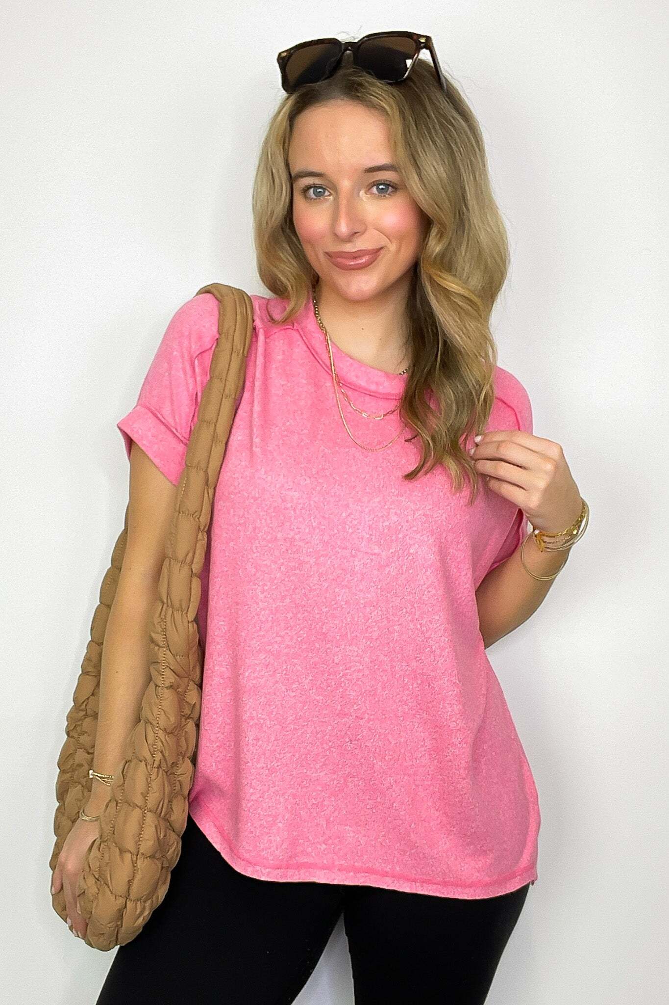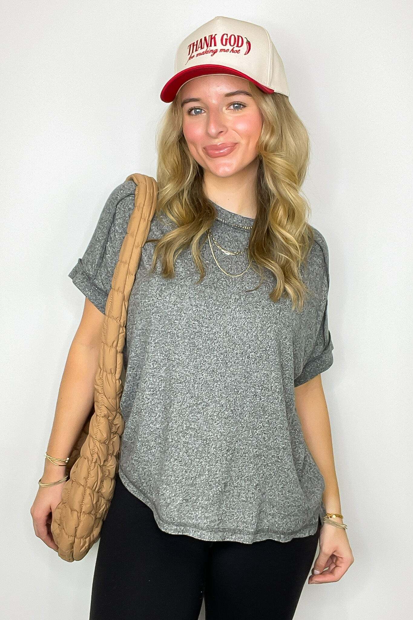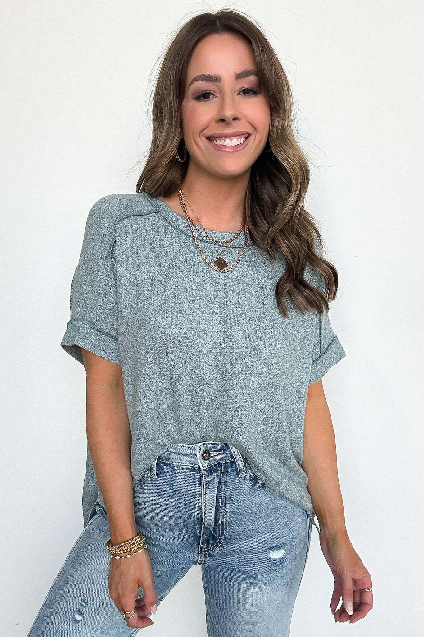 Details: Upgrade your basic tee with our Melange High Low Tee. Made from soft hacci fabric, this tee features folded sleeves and a trendy hi-low hem with side slits. Exposed seams add an edgy touch. Perfect for adding flair to any casual outfit!