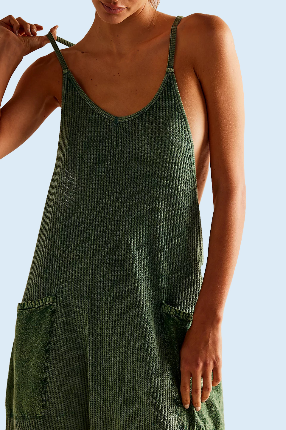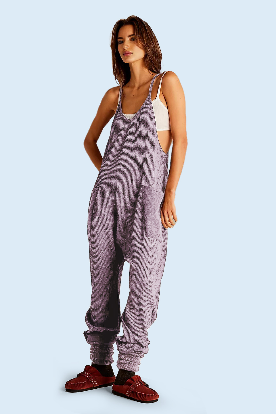 The scoop V-neckline adds a touch of femininity to the jumpsuit, and the dropped side pockets are a practical feature, allowing you to keep your essentials close at hand.