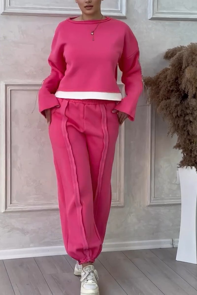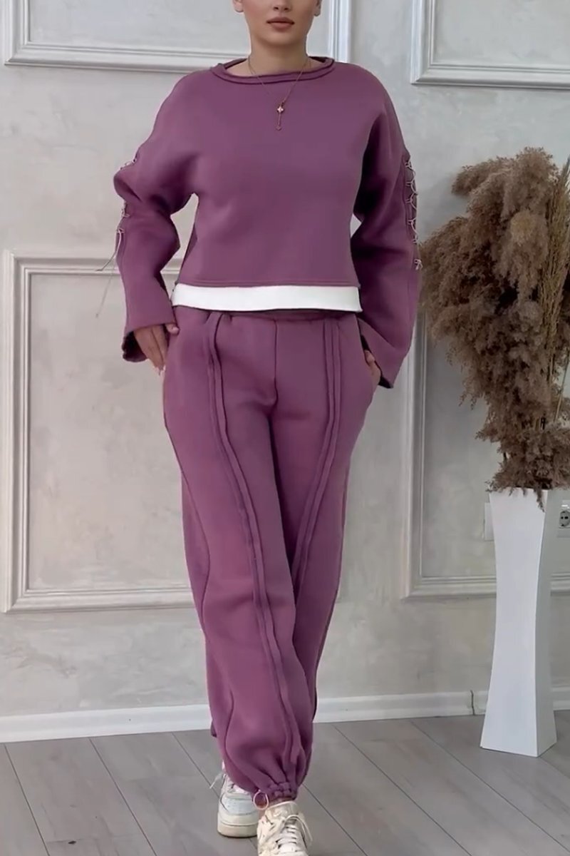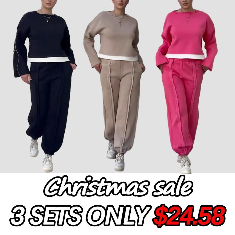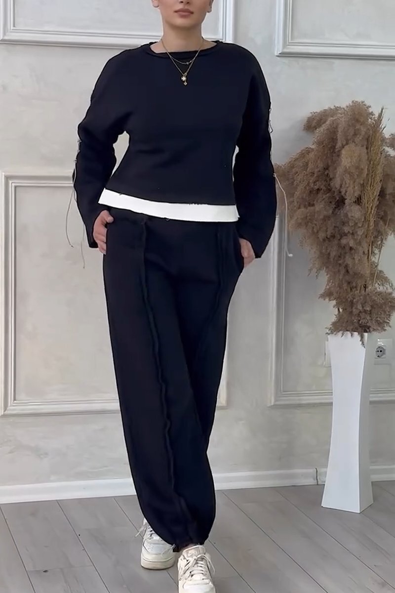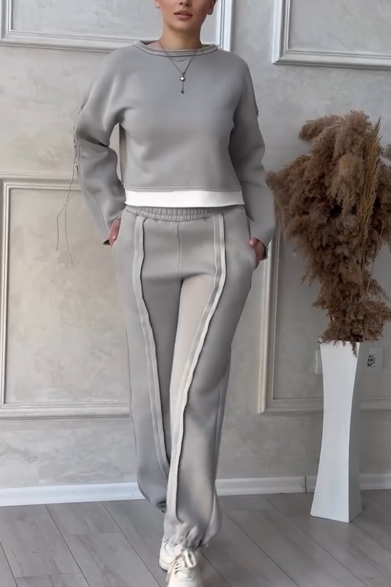 • Women's Casual Round Neck Contrast Patchwork Sweatpants Suit