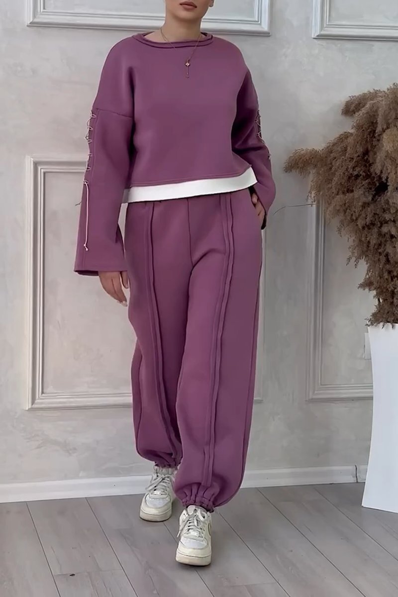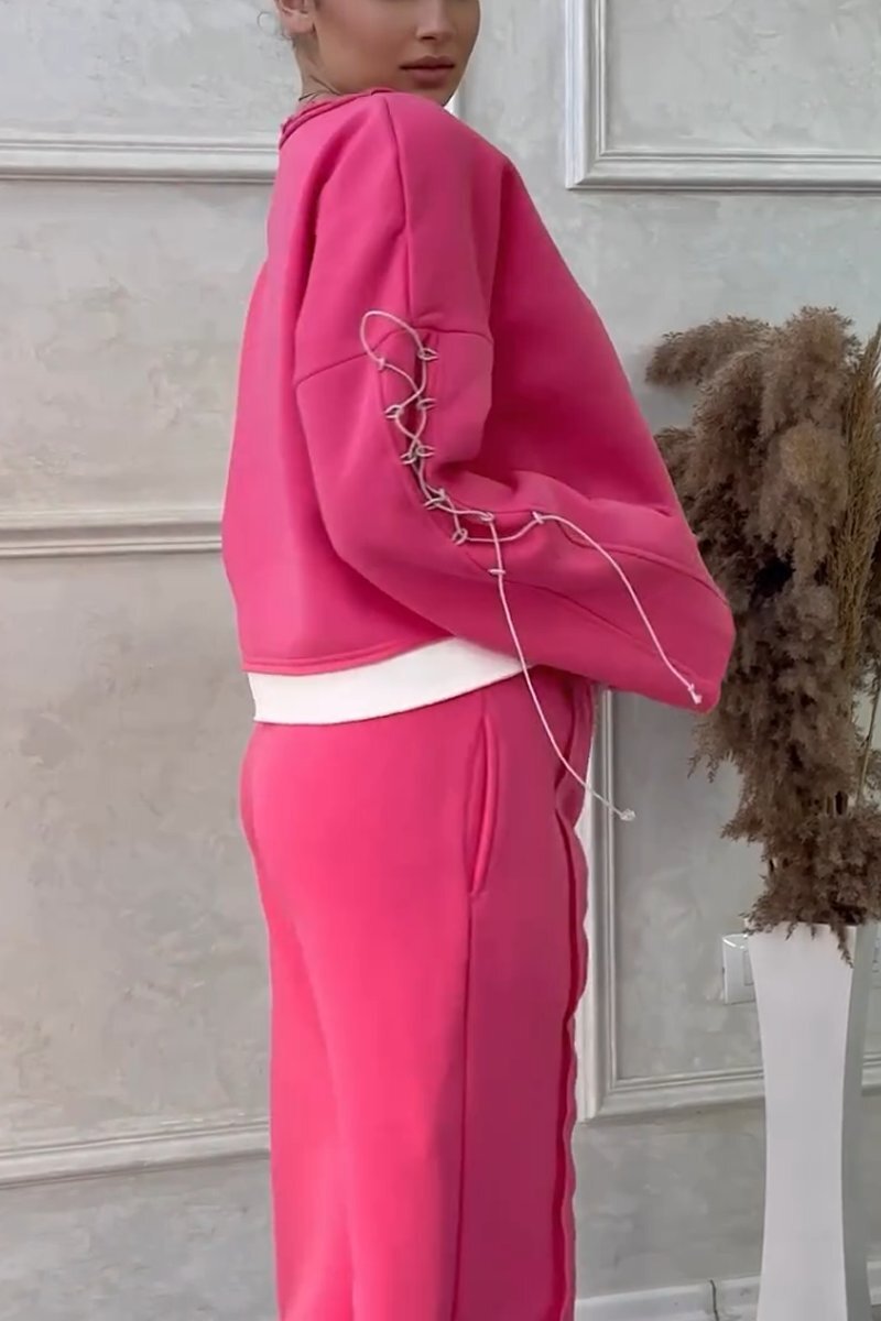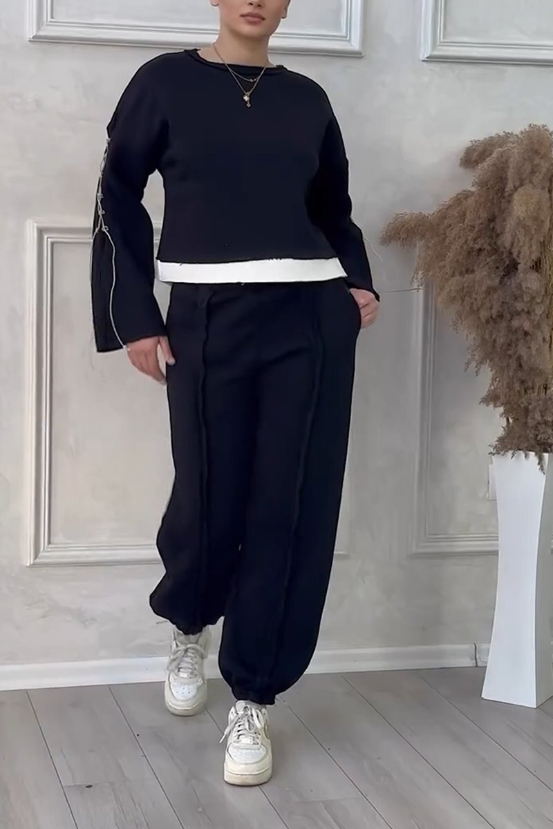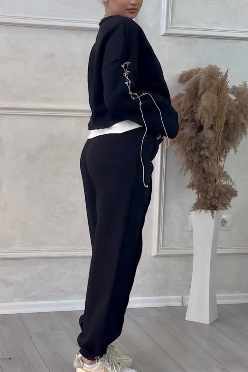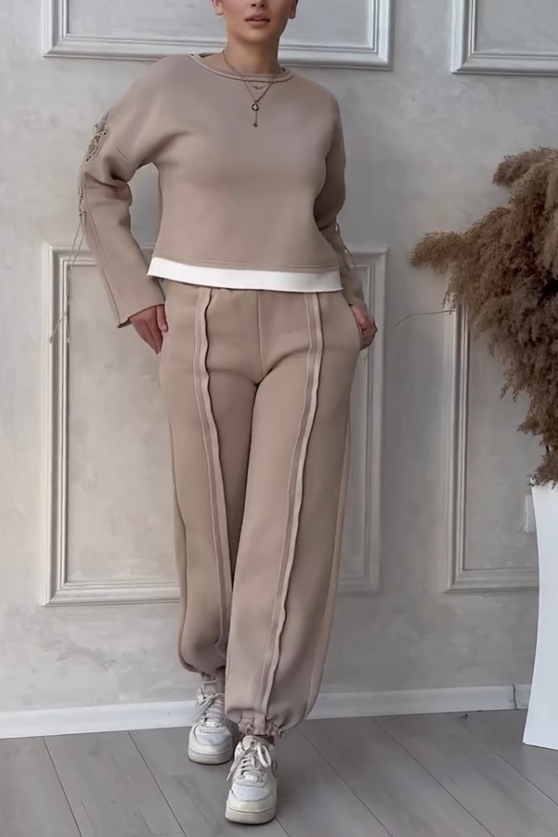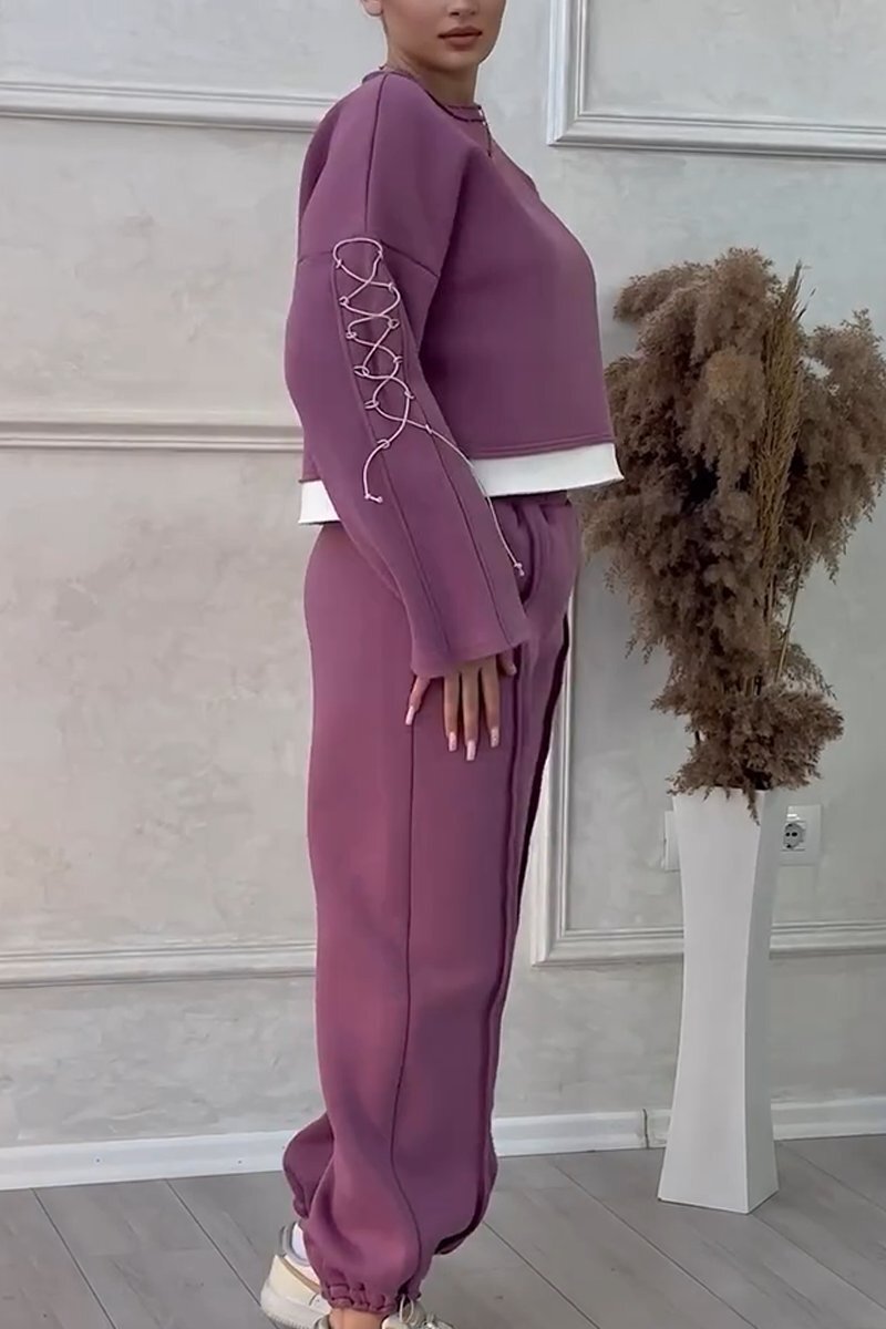• Women's Casual Round Neck Contrast Patchwork Sweatpants Suit
